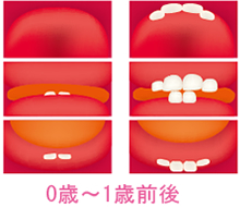 幼児期の食事のしかたによって、口腔内の環境はおおいに影響されます。下のイラストを参考に、歯が生えてくるそれぞれの時期にあわせて、食事の工夫をしてみてください。