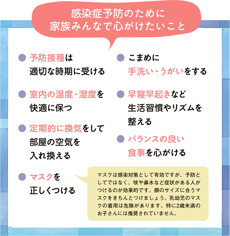 風邪の主な原因であるウイルスは200種類以上あるといわれ、感染経路は主に飛沫感染や、手指を介した接触感染が挙げられます。ほとんどのウイルスには有効な治療薬がないため、熱や鼻水、咳といった辛い症状を和らげる対症療法しかありません。お子さんを感染症から守るために、日頃から家族みんなで予防を心がけることが大切です。そして心配な症状があれば、かかりつけ医に相談しましょう。