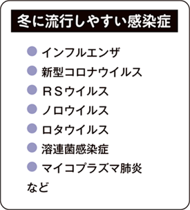 冬に流行する感染症といえば「風邪」がありますが、そもそも「風邪」とはウイルスや細菌によって、鼻やのどなどに急性の炎症が起こる感染症の総称(「風邪症候群」と呼びます)です。