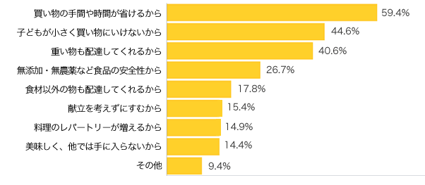 宅配食材の利用の理由は、59.4%と半数以上の方が「買い物の手間や時間が省けるから」とお答えに。家事や育児に追われていると、買い物がおっくうになってしまいますよね。