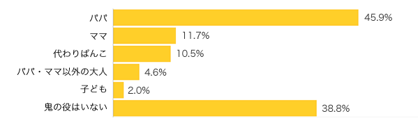 お家で豆まきをされる時の鬼役は、「パパ」とお答えの方が45.9%。体が大きくて、迫力があるからかな?