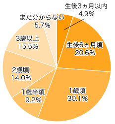 はじめて髪の毛をカットしたのは、「1歳頃」とお答えの方が多く、30.1%。続いて、「生後6ヵ月頃」とお答えの方で20.6%でした。ただ、髪の毛の伸びるスピードは十人十色なので、年齢にはバラつきがあり、「3歳以上」とお答えの方も15.5%いらっしゃいました。