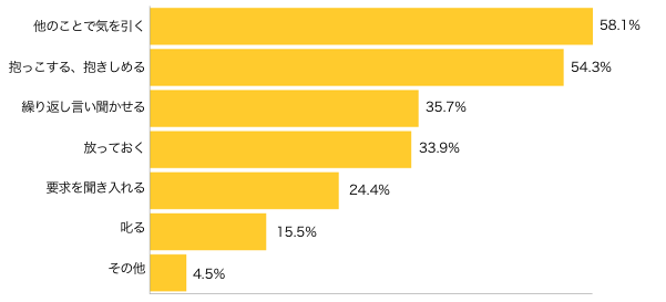 イヤイヤの対処は、「他のことで気を引く」とお答えの方が58.1%。イヤイヤの原因を取り去ることができなくても、