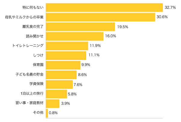 1歳の誕生日を機に始めた(始めようと思っている)ことは、「特に何もない」とお答えの方が32.7%。1歳を迎えたことがまずうれしく、具体的にはこれから考えられるのかも。