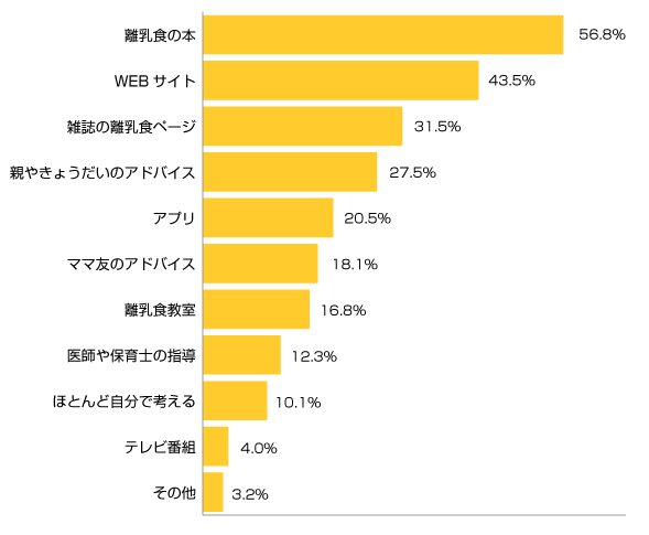 離乳食のメニューで参考にされているものは、「離乳食の本」とお答えの方が56.8%と半数以上。材料や作り方が詳しく掲載されていることはもちろん、本は必要な時にさっと読める、キッチンで作りながら見ることができるのがいいですよね。「雑誌の離乳食ページ」を参考にされている方も31.5%いらっしゃいました。