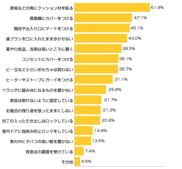 トップは、「家具などの角にクッション材を貼る」。Q1で伺った事故経験では、「机の角などで頭をぶつけた」という方が多かったこともあり、慌てて対策をした、ママ友などから事故にあったことを聞いて「ウチも!」とカバーなどを付けられたのでは。