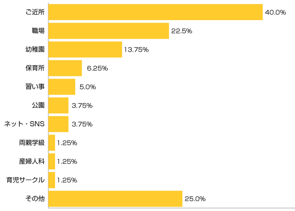 続いて多かったのは、「職場」とお答えの方で22.5%。同年代の子どもがいることから、同僚からパパ友になられたのでしょう。
