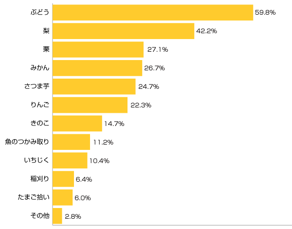 体験したい味覚狩りは「ぶどう」がトップで、59.8%。秋のフルーツの代表的存在であり、もぎたてのおいしさは抜群。リッチな気分も味わえますよね。