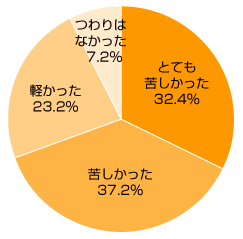 妊娠中のつわりは「苦しかった」とお答えのママが37.2%、「とても苦しかった」とお答えのママが32.4%と、7割近くの方が苦しかった回答、「軽かった(23.2%)」「つわりはなかった(7.2%)というママは少なめでした。
