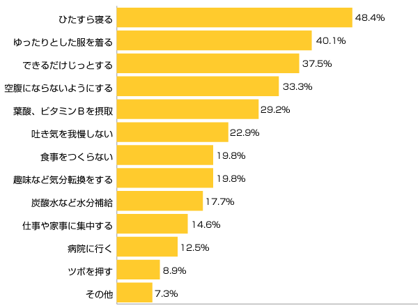 トップは「ひたすら寝る」。吐き気や頭痛などが起きても、妊娠中は薬で抑えることが難しく、だるさも眠気も「身体を休めるしかない」のかもしれませんね。
