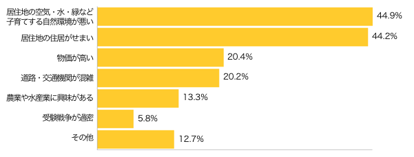 トップは、「居住地の空気・水・緑など子育てする自然環境が悪い」。お子さまは自然豊かなところで、のびのび育てたいという思いがあるのでしょう。
