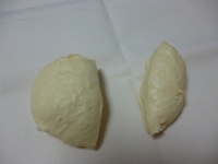 初回の「てるてるぼうずパン」の基本の生地作り(手ごね)の~基本の生地のこね方~の要領で上記の分量をこねて、ラップをしてあたたかい所に1時間程度置いて一次発酵させる。