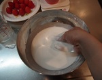 ②ボウルに白玉粉を入れ、水を加えながらホイッパーでダマにならないように混ぜる。