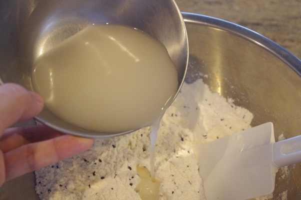 材料をデジタルスケールで計量します。ボウル大に強力粉、きび糖、塩、黒ゴマ。