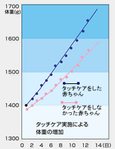 日本タッチケア協会は、『タッチケアの効果は、低出生体重児(未熟児)をはじめとするハイリスク児に限定されたものではありません。ごく一般的な乳幼児にとっても、同様の効果があることが、研究からも実証されています。マッサージを受けた低出生体重児は、マッサージを受けていないグループより、1日あたりの体重増加が平均で約47%高いという結果が得られました。』と報告しています。