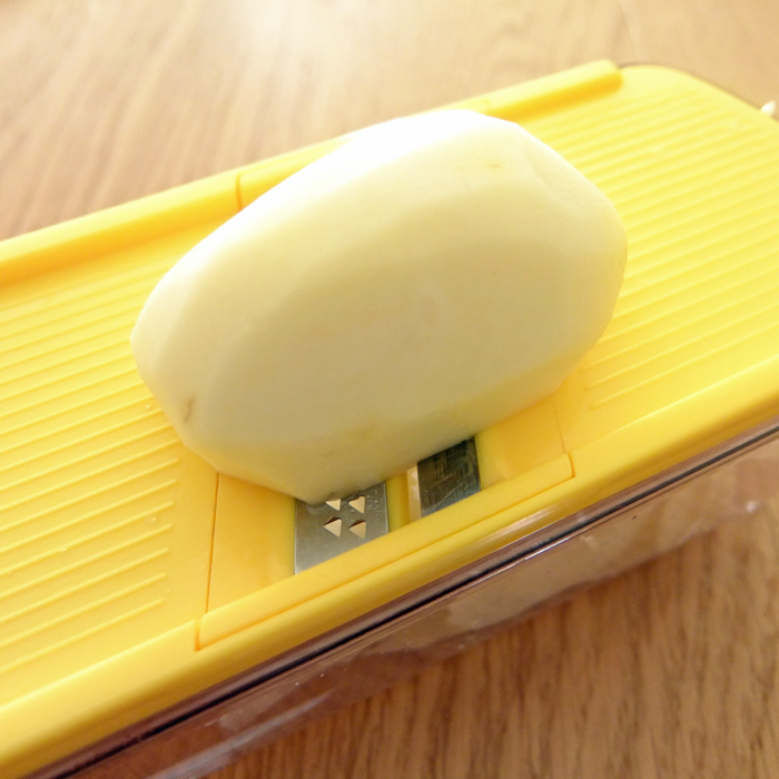 ① じゃがいもをむいてピーラーで細い千切りにし、水にとって澱粉を落とす