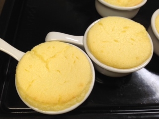 (焼きたてはスフレのように、ふわふわしてます。冷めると生地は沈んできますが、生地が落ち着くのでフルーツをのせやすくなります)