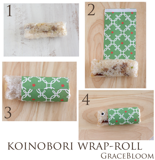 1.中華風おこわを細めの俵型おむすびにし、ラップで包んでおく。ラップの両端は裏側に畳んでおく。
