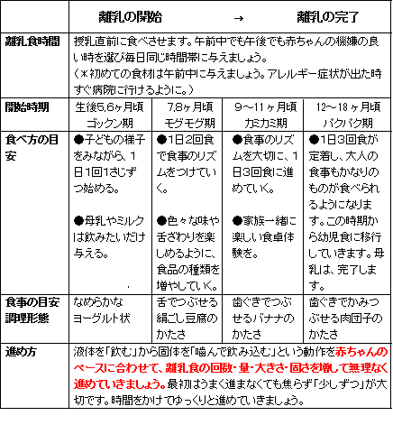 赤ちゃんの食欲・成長・発達(消化機能・咀しゃく)の様子を見ながら進めましょう。初めての食材は、1日1さじからスタートし、少しずつ食べられる量・食品を増やしていきましょう!