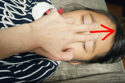 仰向けに寝かした状態で、眉間(眉毛と眉毛の間)に指を当て軽く上方へ引き上げる
