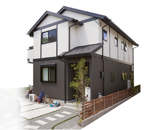 焼杉&櫛引調の外観でしっとりと。真壁造り風の落ち着いた佇まい。