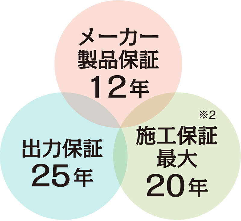 ※2 施工保証については、基本保証10年+延長保証10年となります。施工保証はHESTA大倉認定工事者が施工した場合にのみ有効です。施工保証の条件として別途メンテナンス契約の締結が必要です。製品保証および出力保証の適用はHESTA大倉発行「メーカー認定保証書」に準じます。HESTAソーラー保険による補償には上限金額があります。その他保証に関する諸条件についてはお問い合わせください。