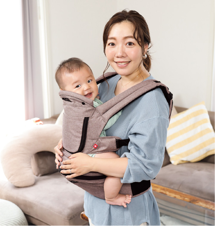 絵里子ママ、周音(あまね)くん(4ヵ月)初めて使いましたが、肩にくい込まないことにびっくり。抱っこのときは赤ちゃんを腰骨に乗せがちですが、これはシートで支えるので反り腰にならないのもいいですね。
